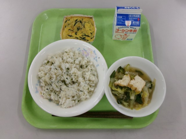 12月9日(火)の給食 公開日 2025/12/10 更新日 2025/12/09 給食献立 今日の献立は【茎わかめごはん ひじき入り卵焼き みそ汁 牛乳】でした。☆食材の産地☆ 玉ねぎ:北海道 じゃがいも:北海道 鶏卵:青森県 長ねぎ:栃木県 青菜:栃木県 白菜:群馬県 にんじん:千葉県 鶏肉:宮崎県 ひじき:韓国