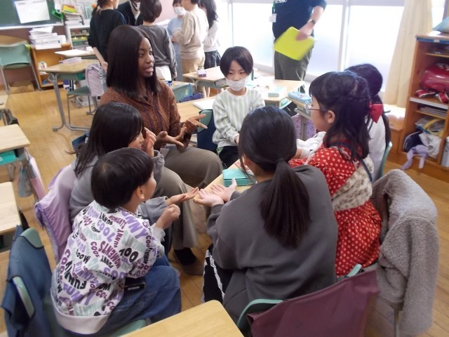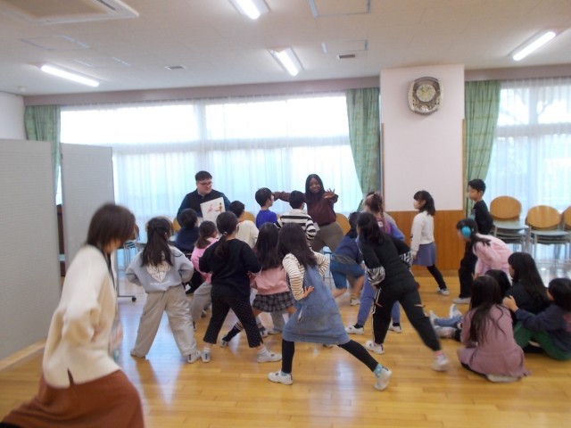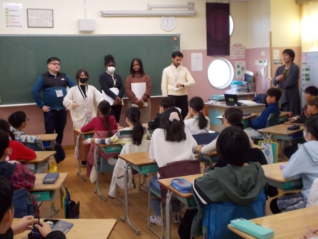 対象は1~4年生。とくに1,2年生はなかなか英語に触れる機会がないため、様々な国の出身の方たちと実際に生で触れる機会となりました。ジェスチャーを交えた実際の英語に触れ、どんなことを話しているのか類推しながら会話を楽しんでいる様子でした。3,4年生は実際の会話や世界の国の様子について英語で話を聞き、様々な国の文化の違いや様子に興味津々の様子でした。