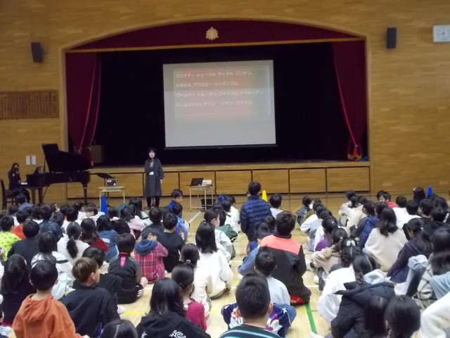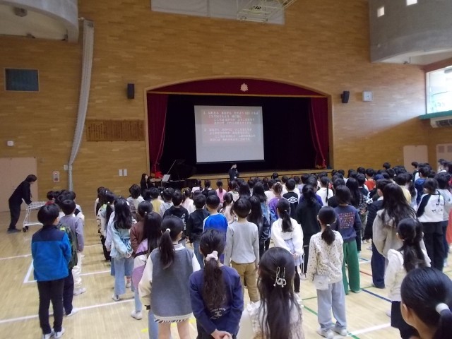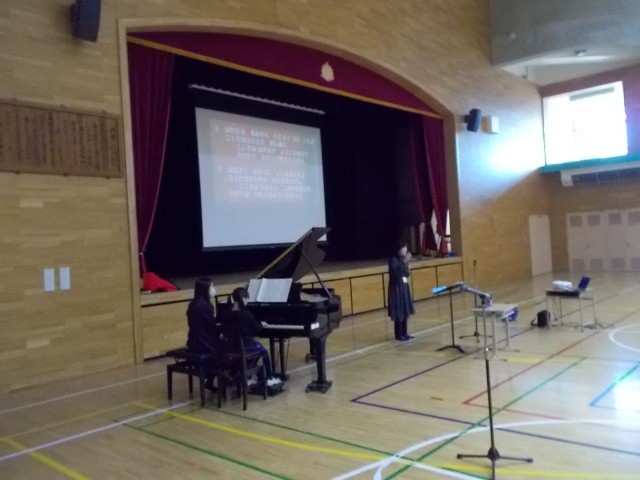 ドイツ語の合唱はなかなか難しい・・・できない部分は「ららら」で構わないということで、歌ってみると、きれいな歌声での合唱となりました。また、今日は特別に本校児童親子の伴奏も集会のお手伝いをしていただきました。