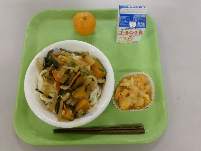 12月12日(金)の給食 公開日 2025/12/12 更新日 2025/12/12 給食献立 今日の献立は【ほうとう風うどん じゃがいものチーズ焼き みかん 牛乳】でした。☆食材の産地☆ かぼちゃ:北海道 じゃがいも:北海道 玉ねぎ:北海道 鶏肉:岩手県 白菜:長野県 青菜:埼玉県 大根:千葉県 にんじん:千葉県 みかん:佐賀県