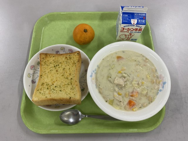1月15日(木)の給食 公開日 2026/01/17 更新日 2026/01/15 給食献立 今日の献立は【ガーリックトースト コーンチャウダー みかん 牛乳】でした。☆食材の産地☆ 玉ねぎ:北海道 にんにく:青森県 セロリー:長野県 にんじん:千葉県 キャベツ:愛知県 鶏肉:宮崎県 みかん:長崎県