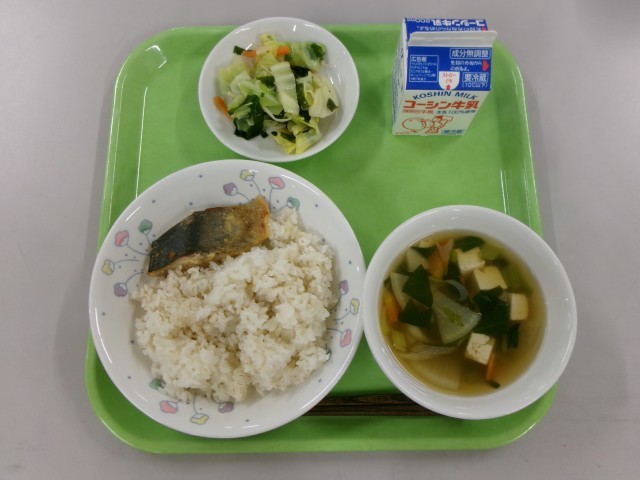 1月16日(金)の給食 公開日 2026/01/17 更新日 2026/01/16 給食献立 今日の献立は【ごはん あじの西京味噌焼き 和風きのこサラダ すまし汁 牛乳】です。☆食材の産地☆ あじ:ニュージーランド 長ねぎ:栃木県 しめじ:長野県 えのきたけ:長野県 青菜:埼玉県 にんじん:千葉県 大根:千葉県 キャベツ:愛知県