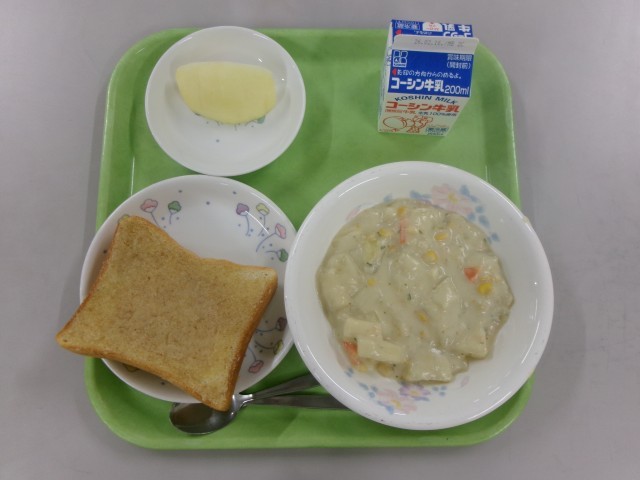2月9日(月)の給食 公開日 2026/02/12 更新日 2026/02/10 給食献立 今日の献立は【練りごまトースト 米粉のシチュー りんご 牛乳】でした。☆食材の産地☆ 玉ねぎ:北海道 にんにく:青森県 クリームコーン:タイ にんじん:千葉県 鶏肉:宮崎県 じゃがいも:鹿児島県 りんご:青森県