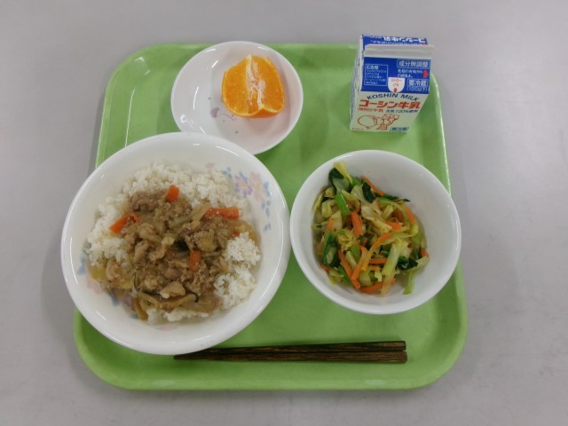 2月27日(金)の給食 公開日 2026/03/05 更新日 2026/03/03 給食献立 今日の献立は【豚肉のおろし丼 おかか和え 甘平 牛乳】でした。☆食材の産地☆ 玉ねぎ:北海道 豚肉:群馬県 青菜:埼玉県 にんじん:千葉県 大根:千葉県 キャベツ:愛知県 しょうが:高知県 甘平:愛媛県