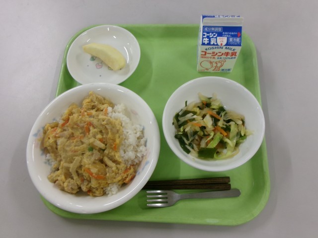 3月19日(木)の給食 公開日 2026/03/26 更新日 2026/03/24 給食献立 今日の献立は【変わり親子丼 大根サラダ りんご 牛乳】でした。☆食材の産地☆ 玉ねぎ:北海道 鶏卵:青森県 大根:千葉県 にんんじん:千葉県 キャベツ:愛知県 鶏肉:宮崎県 りんご:青森県