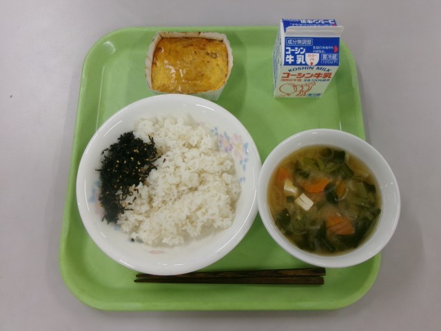 【ごはん ピリ辛ふりかけ あんかけ卵焼き かぶのみそ汁 牛乳】でした。