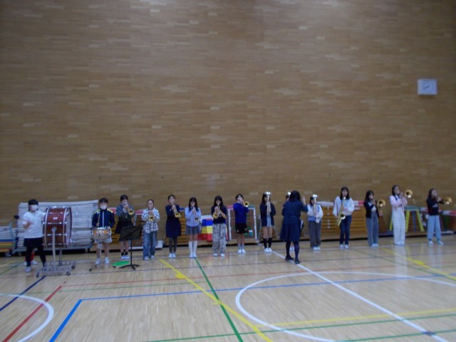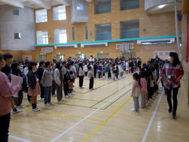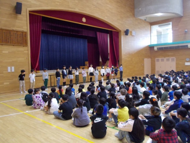 本日は1年生が初めて全校朝会に参加しました。始めに対面式を行い、1年生と2~6年生の児童が向き合って「よろしくお願いします」のあいさつをしました。1年生は緊張した様子でしたが、全校児童の中に加わると、静かにお話を聞くことができました。本校では入場と退場は金管バンドクラブの演奏で行っています。すてきな演奏でしっかりとした入退場行進もできました。