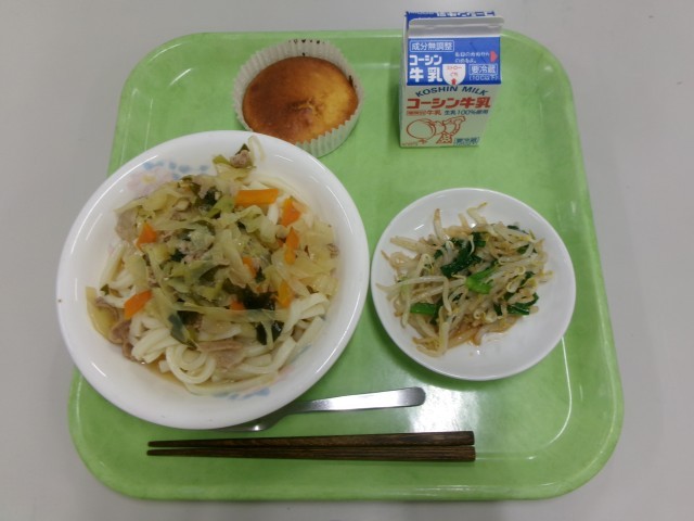 4月23日(木)の給食 公開日 2026/04/24 更新日 2026/04/23 給食献立 今日の給食は【わかめうどん もやしの胡麻醤油和え ヨーグルトケーキ 牛乳】です。☆食材の産地☆ 鶏卵:青森県 豚肉:群馬県 もやし:栃木県 にら:茨城県 青菜:埼玉県 玉ねぎ:千葉県 キャベツ:静岡県 レモン:広島県