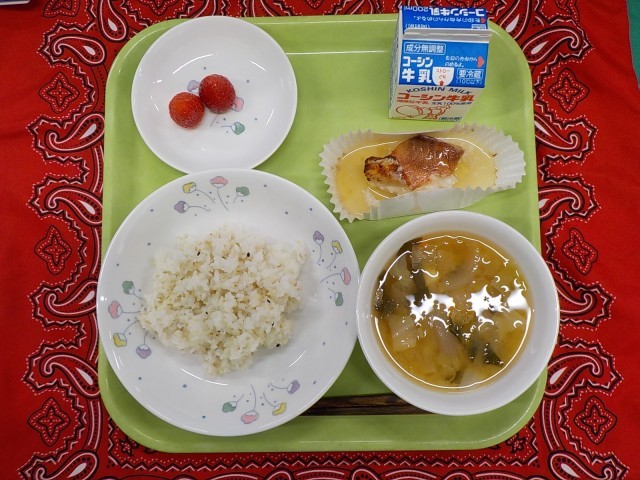 ・牛乳 ・ごまごはん ・赤魚のレモン風味 ・みそ汁 ・いちご 今日は「あまつっこ...