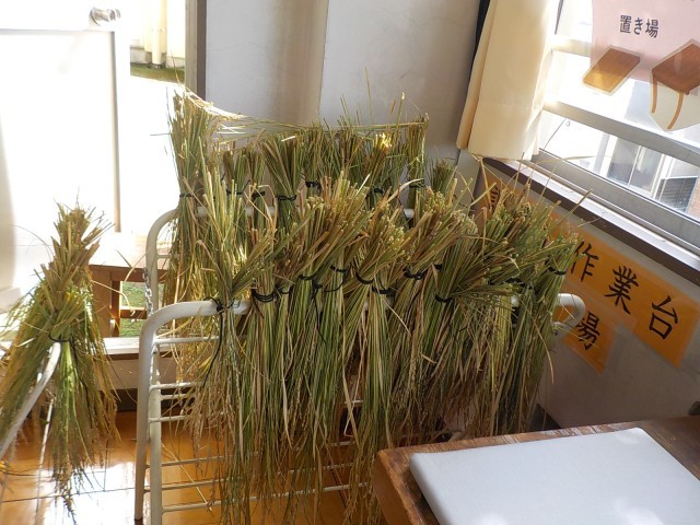 稲刈りした後は、家庭科室にて乾燥させています。子供たちは良い体験ができています。