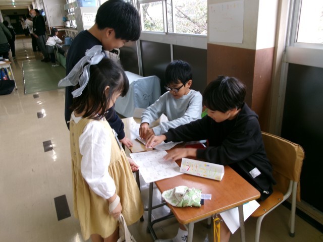 代表委員の児童の司会進行で、放送を使ってはじめの会をしました。その後、前半後半で交代してお店の係とお客さんになりました。なかよし班のペアで相談しながらお店巡りをしたり、クラスのお店の係を協力して行ったり、たくさんの頑張りと、笑顔に満ちた時間になりました。終わりの会も放送で行い、子どもまつりは無事終了。振り返りとして、メッセージカードにペア学年へのおたよりを書いて送りました。