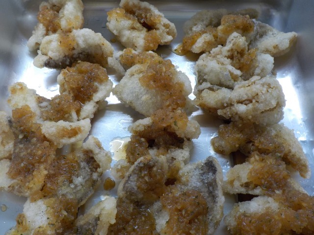 助宗たらの玉葱ソースは、カリッと揚げた魚に、玉葱のコクがでたソースをかけて仕上げました。ソースは、玉葱・にんにく・生姜を炒め、薄口醤油・酒・みりん・砂糖で味付けをしました。