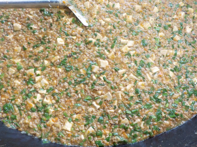 マーボー豆腐の豆腐は、一人120g学校全体で50Kg使用しました。