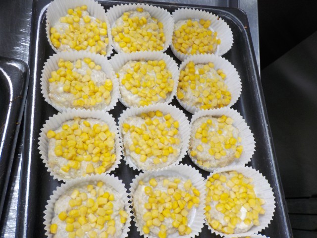 鶏と豚の挽肉に、塩・こしょう・豆腐・醤油・澱粉・玉葱・生姜・にんにくを加え、よく混ぜカップに入れます。上にコーンをのせて、オーブンで蒸しました。