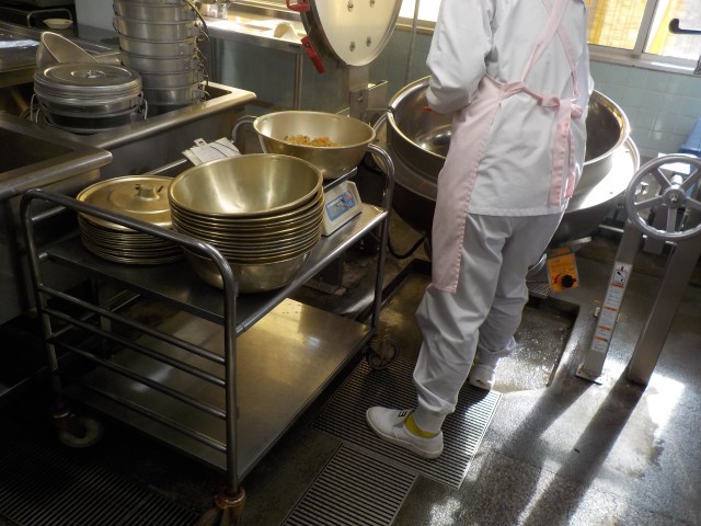今回は、給食室でそぼろをご飯に混ぜてあるので、配膳がスムーズにできました。