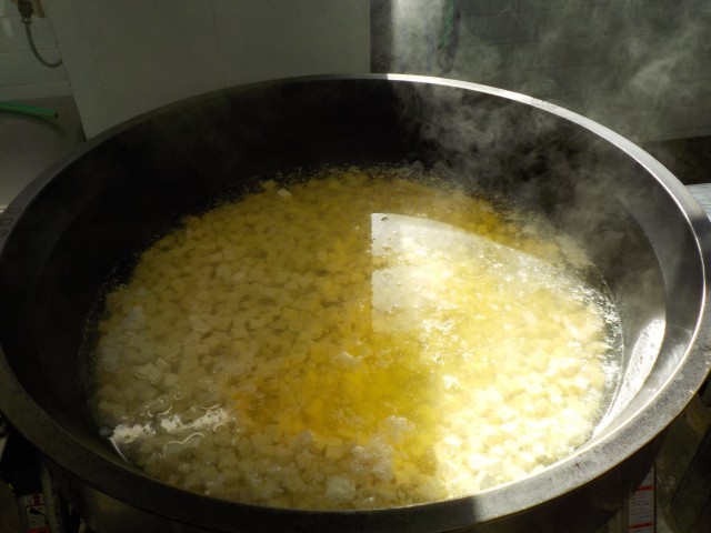 この作業のおかげで、豆腐あんを合わせた後、短時間で豆腐が崩れること無く、仕上がります。