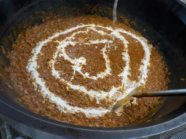 ポークストロガノフは、豚肉・玉葱・マッシュルームをトマトピューレや中農ソースで煮込み、生クリームを回し入れて完成です。