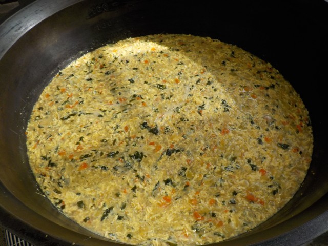 片栗粉でとろみを付け、卵を回し入れます。最後にワカメを加えて完成です。
