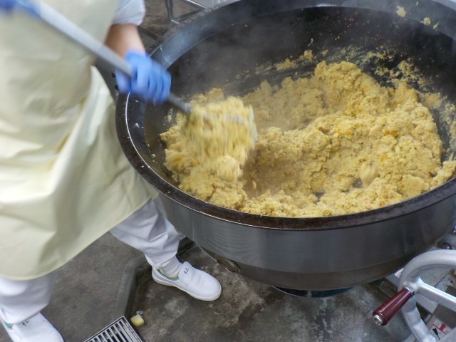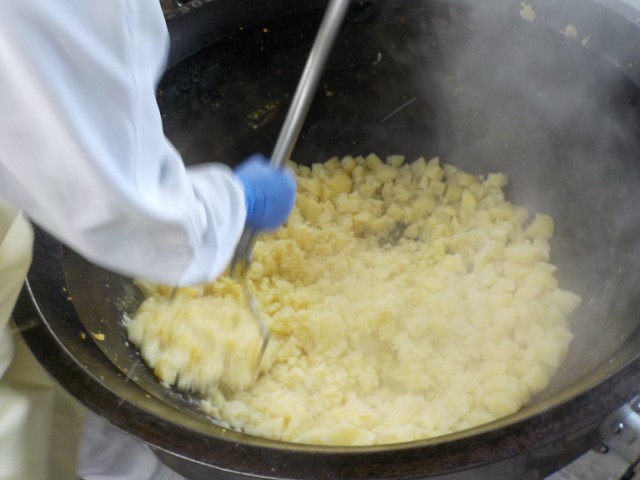 41Kgのじゃが芋は、オーブンで蒸したあと、大きなポテトマッシャーでつぶします。
