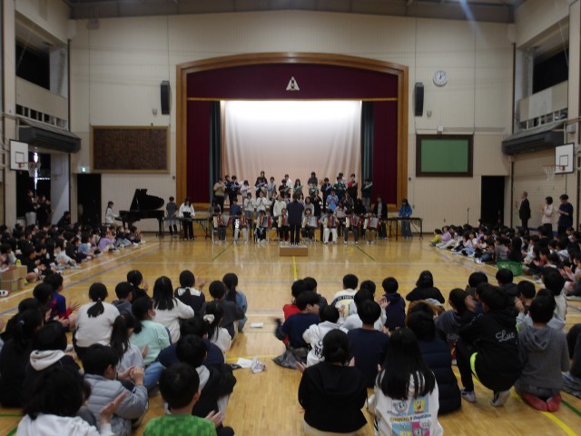 6年生を送る会を行いました。計画委員会の児童が司会・進行を務め、1年生から5年生までが心のこもった出し物を披露しました。どの発表も工夫にあふれ、6年生への感謝の気持ちが伝わる素敵な時間となりました。6年生は、お礼として各学年へのメッセージ送り、「最高到達点」の合奏を披露しました。会場は温かい雰囲気に包まれ、思い出に残る会となりました。