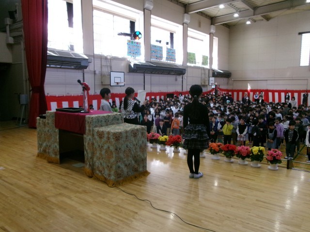 学年代表の児童が校長先生から修了証を受け取りました。次に、校長先生からのお話がありました。その後、児童代表の言葉、春休みの過ごし方についての話、表彰、異動する教職員の紹介とあいさつがありました。