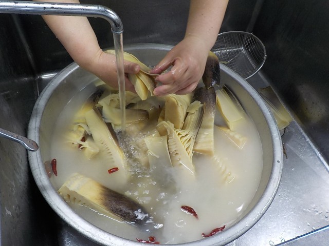 朝一番に、米ぬかと唐辛子を入れた釜で茹でた竹の子は、香りと歯触りがよく、とても美味しくできました。