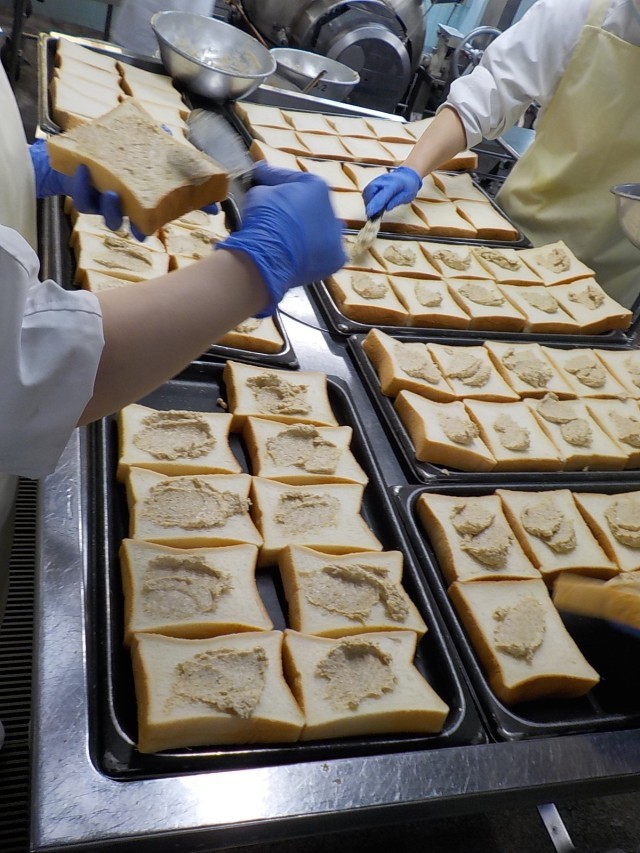セサミトーストは、マーガリンに白ごまと砂糖を合わせたものをパンにぬり、オーブンで焼きました。