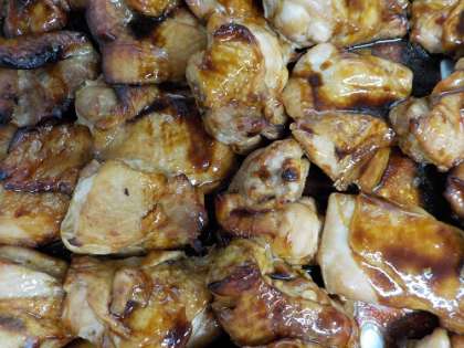 隠し味として紹興酒を入れ、中華料理らしさをだしています。下味を付けた鶏肉を焼き、クラスごとに配缶します。仕上げにタレをかけると、美味しそうな照りがでました。