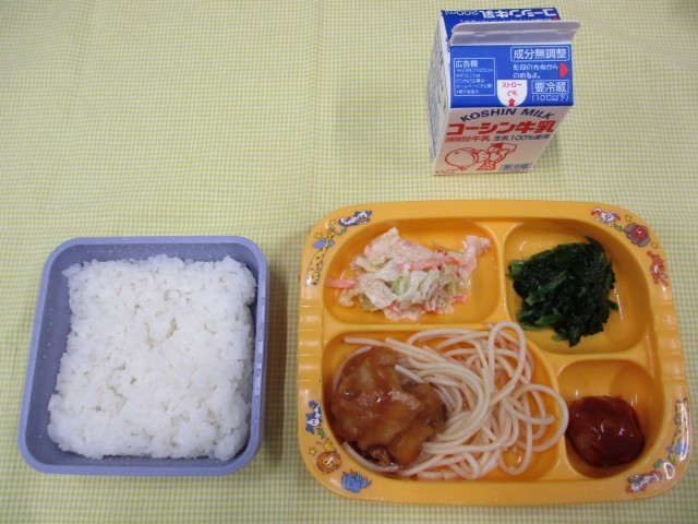 ごはん、ミートボールのケチャップ炒め、カレー切り干し、にんじんしりしり、なめたけ...