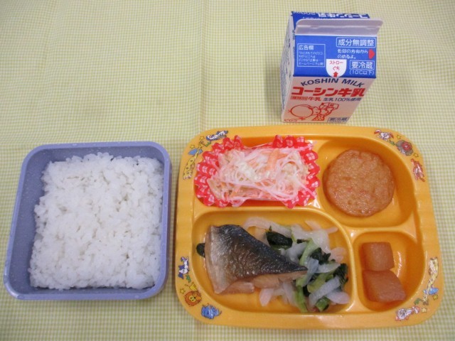 ごはん、ぶりの照り焼き、小松菜ソテー、春雨マヨサラダ、さつま揚げ煮、ピリッと大根