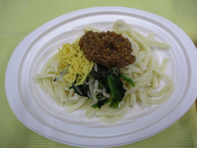 ジャージャーうどんは、肉味噌、きんし卵、やさいを各自うどんに混ぜて食べました。カボチャのバター煮は、ほくほく、甘く優しい味付けでした。