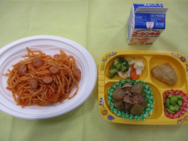 ナポリタンスパゲッティ、豆腐ナゲット、大根と豚肉のうま煮、花野菜サラダ、枝豆ペペロン
