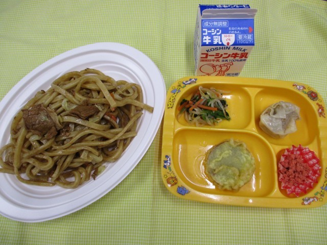 焼きうどん、さつま芋の天ぷら、千草和え、シュウマイ、鮭フレーク