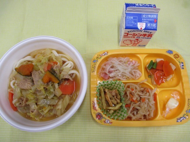 ほうとううどん、もやしベーコン炒め、高野豆腐の煮物、カリカリ切り干しサラダ、キャンディーチーズ
