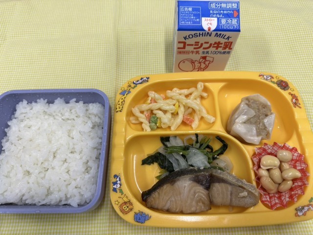 ごはん、ぶりの生姜焼き、ほうれん草ソテー、しゅうまい。マカロニサラダ、煮豆