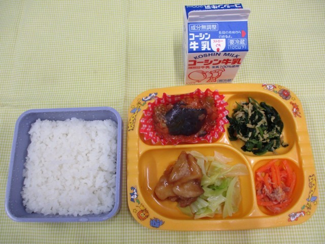 ごはん、チキン南蛮漬け、なすのトマト煮、にんじんツナ、ほうれん草と錦糸卵の和え物