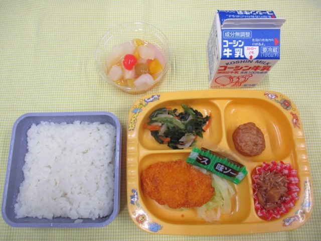 ごはん、なめたけ、サーモンフライ、ポパイソテー、玉ねぎボール、フルーツポンチ