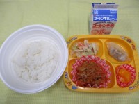 ごはん、ポークチャップ、ビーフン炒め、白菜のおひたし、ミックスベジタブルソテー
