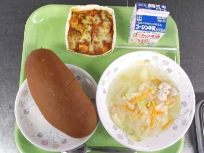 黒砂糖パン、豆腐のミートソースグラタン、野菜スープ