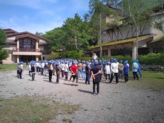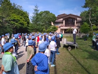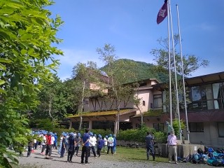 榛名林間学園に到着。早速、入園式。赤小の校旗が園庭に翻ります。