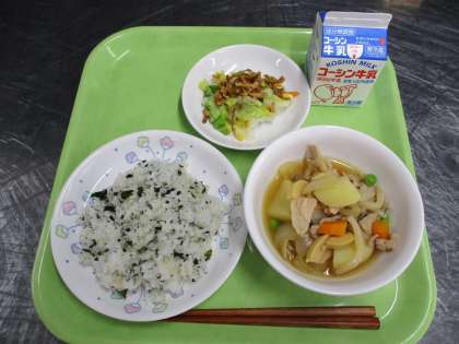 わかめごはん、五目肉じゃが、ごぼうのパリパリサラダ