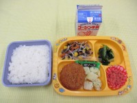 ごはん、さくさくメンチカツ、小松菜ひじき、マカロニケチャップ、パイン缶メンチカツ...