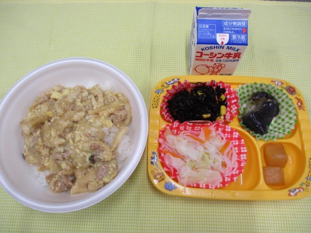 中華丼、ちくわの磯辺揚げ、もやしのさっぱりサラダ、たらここんにゃく、お豆の煮物中...