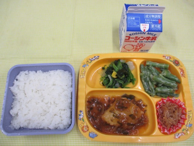 ごはん、カレイのねぎだれかけ、ポパイソテー、インゲンの甘味噌和え、なめたけカレイ...