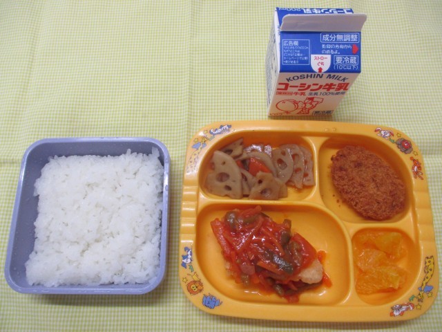 ごはん、ミニかぼちゃコロッケ、白身魚の甘酢あんかけ、れんこんのきんぴら、夏みかん...