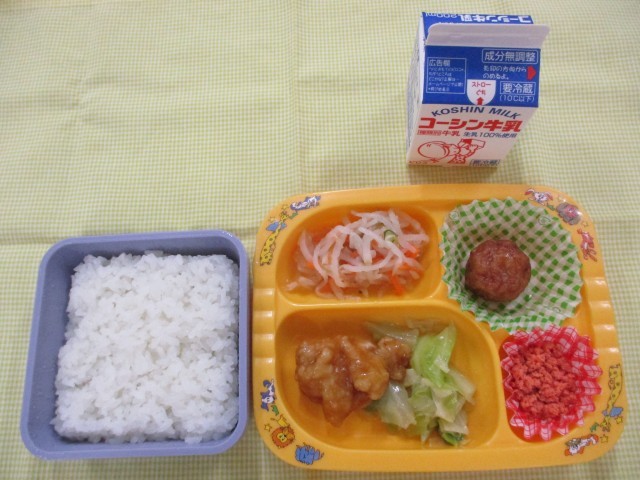 ごはん、甘だれチキン、キャベツソテー、切干大根のパリパリサラダ、玉ねぎボール、鮭...