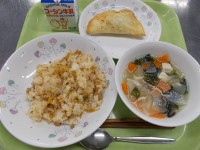 今日の給食は「黒砂糖パン・たらのパン粉焼き・夏野菜ポトフ・牛乳」です。