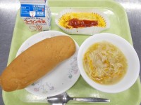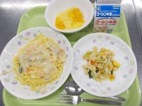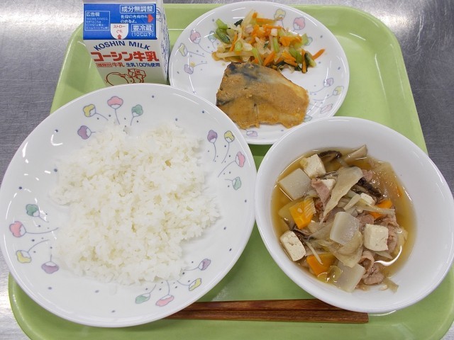 今日の給食は「ごはん・さばのごまみそ焼き・野菜のからし和え・きのこけんちん汁・牛乳」です。