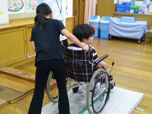 本日は、車椅子を体験し、乗ること、手伝うことの難しさを実感していました。