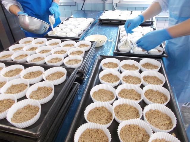 ひき肉、ねぎ、たけのこを炒めて、味付けした具材をカップに入れ、蒸しパン生地を流してオーブンで蒸しました。